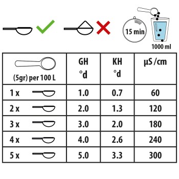 OsmoVital augmente le KH (Dureté Carbonatée) et le GH (Dureté Totale) et ajoute des vitamines et oligo-éléments essentiels tels que le potassium, le fer, le manganèse, le bore, l’iodure, le fluorure. Le KH et le GH contribuent tous deux à un pH stable dans l’aquarium : tandis que le GH fournit les minéraux nécessaires, le KH est plus directement responsable du maintien d’un pH stable, en agissant comme un régulateur.